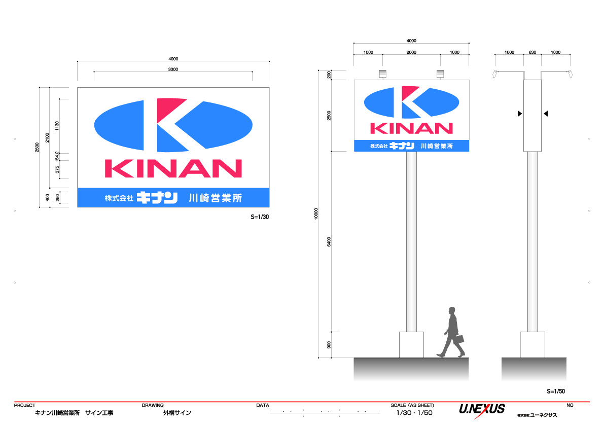株式会社キナン様の大型自立式看板の施工と、本社の銘版を承りました。自立式看板は、大型になると強風時の転倒などに耐えうる設計に留意する必要がありますが、しっかりした地盤調査と基礎工事をすることにより、安全な看板ができあがります。