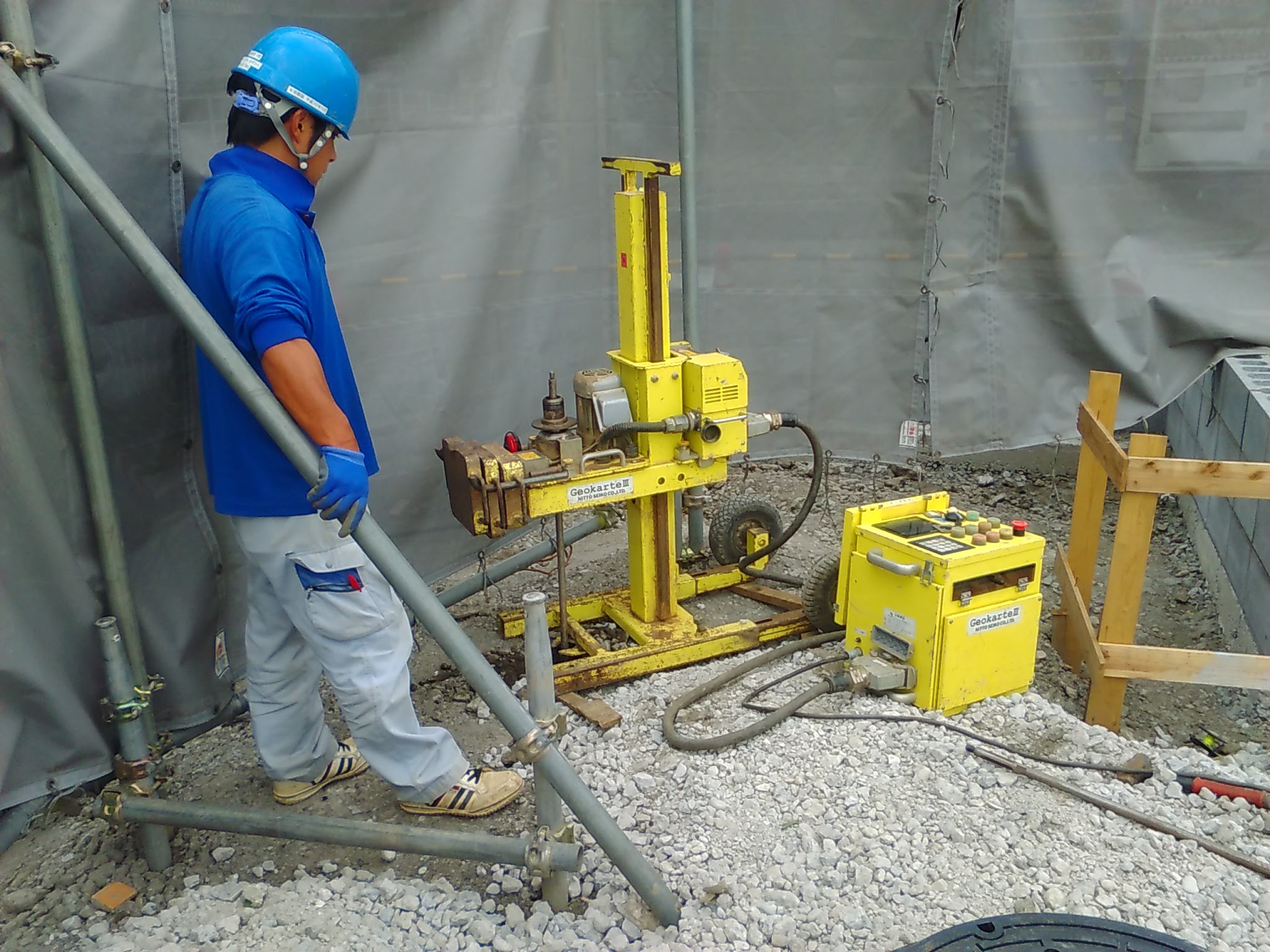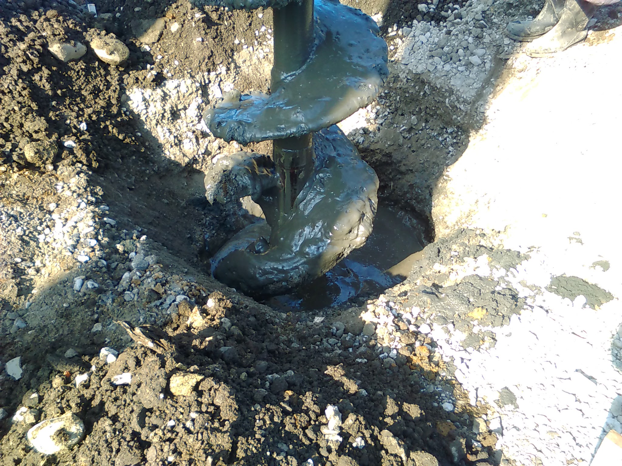 基礎工事:ドリルで掘削すると同時にコンクリートが先端から注入されてます