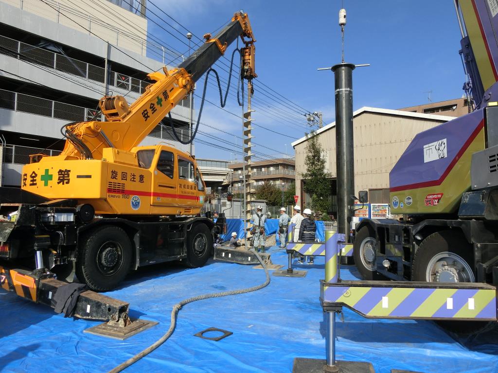 杭基礎工事:アンギラス工法(ラフタークレーンの先のドリルで掘り下げます)